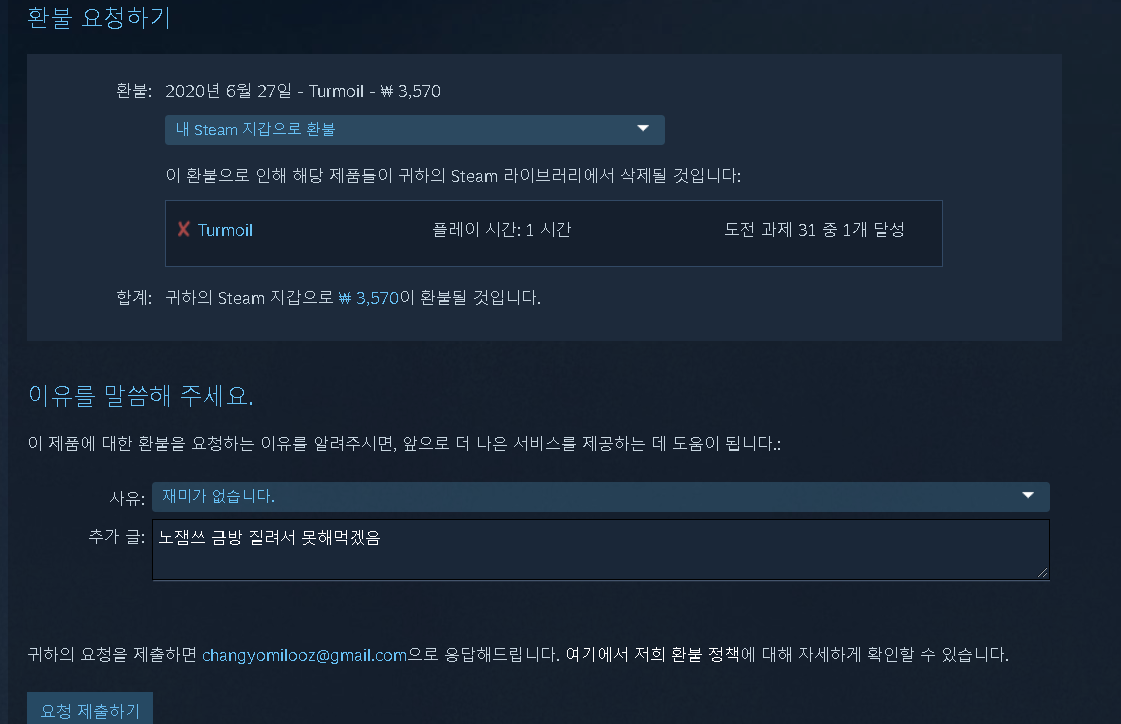저는 스팀 지갑으로 환불을 선택했습니다 환불사유는 정말 아무말이나 적어도 환불해주더라고요