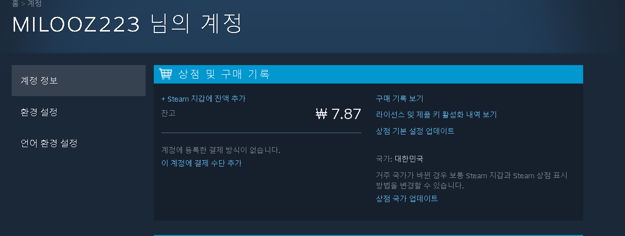웹이던 스팀이던 상관없이 같습니다 일단 눌러줍시다 누르면 밑에 로그아웃 등등 여려개 뜨는데 여러개 뜨는것중 계정 정보를 눌러줍시다